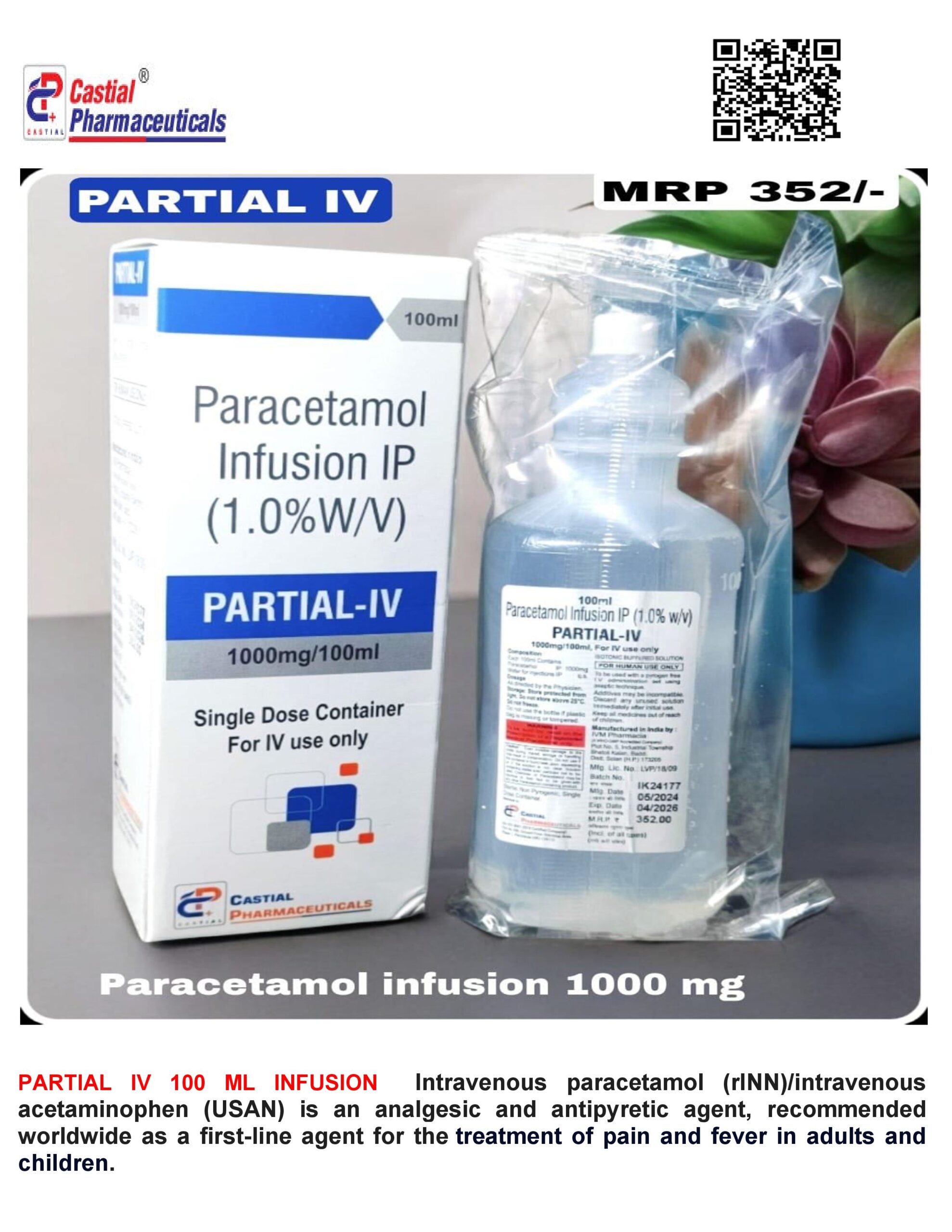 Paracetamol 1000 mg Infusion I.P is a sterile, clear, colorless solution used for the treatment of moderate to severe pain, fever, and inflammation. This medication is administered through an intravenous (IV) infusion, which allows for rapid absorption and onset of action.
